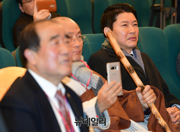 신동욱 공화당 총재가 27일 오후 국회도서관에서 열린 류여해-정준길 북콘서트에 참석하고 있다. 자유한국당은 지난 26일 윤리위원회를 열고 류 전 최고위원과 정 전 대변인에 제명과 경고를 각각 의결했다.