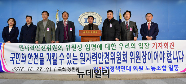 송희경 자유한국당 의원, 김정재 의원, 원자력정책연대 회원 노동조합이 27일 오후 국회 정론관에서 기자회견을 열고, 원자력안전위원회 위원장 임명에 대한 입장을 밝혔다. 이들은 성명을 통해 "위원장 임명 시 시민단체, 정치권 관련 인사와 반원전 활동 경력이 있는 인사는 배제돼야 한다"고 주장했다.