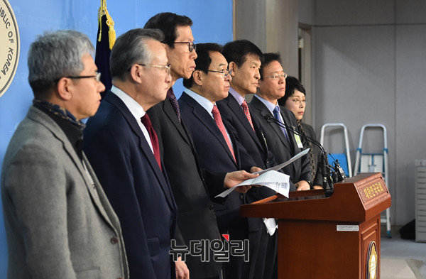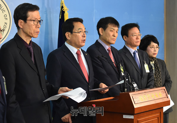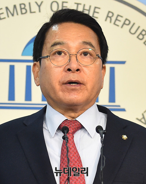 심재철 자유한국당 의원이 28일 국회 정론관에서 '제주 해군기지 구상권 포기 관련 고발' 기자회견을 갖고 있다.
