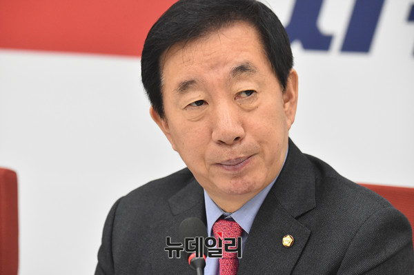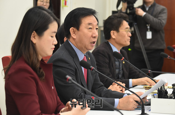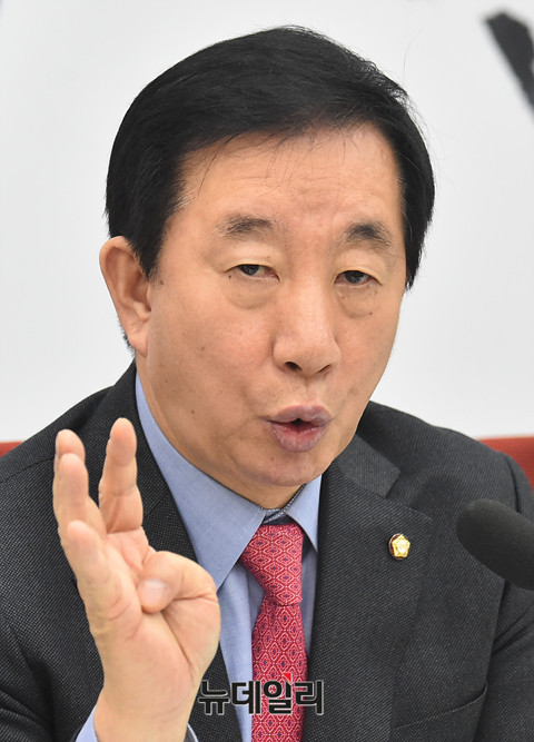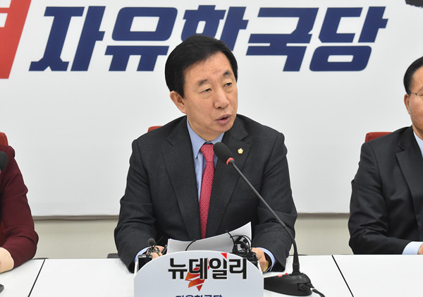 김성태 자유한국당 원내대표가 28일 오전 국회 원내대표실에서 열린 기자 간담회에서 발언을 하고 있다.
