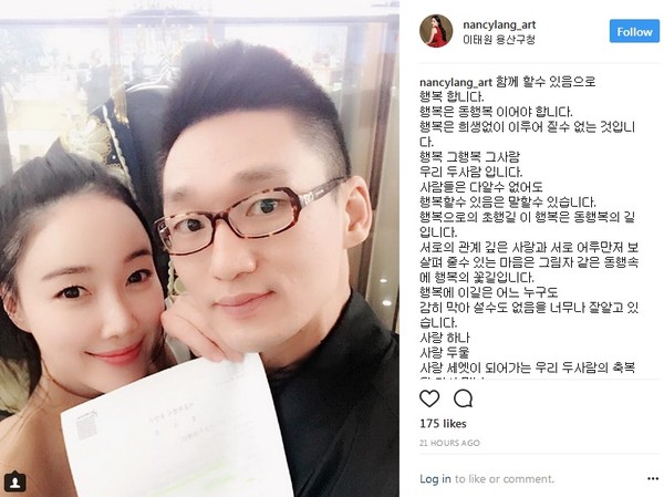 낸시랭은 이날 인스타그램에 "함께 할 수 있음으로 행복하고, 행복은 희생없이 이루어 질 수 없다"는 일종의 '행복론'을 나열한 뒤 한 남성과 '혼인신고서'를 들고 있는 인증샷을 게재했다.