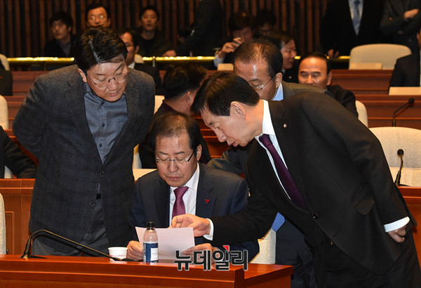 홍준표 자유한국당 대표와 김성태 원내대표 29일 오전 국회에서 열린 의원총회에서 대화를 나누고 있다.
