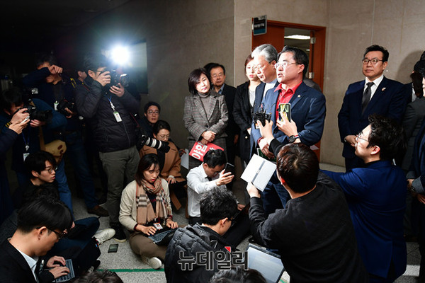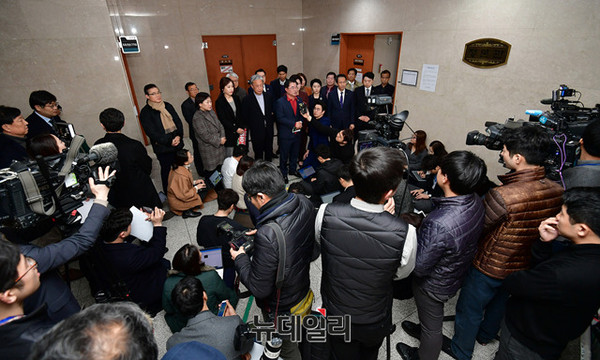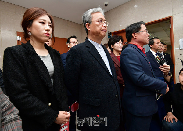 최경환, 유성엽 국민의당 의원이 31일 오전 국회 정론관에서 기자회견을 직후 취재진의 질문에 답하고 있다. 앞서 통합을 반대하는 측 당원들은 "보수야합 중단하고 안철수 대표는 즉각 퇴진하라"고 주장했다. 또 국민의당지키기운동본부 출범을 알리며 "국민의당 개혁정체성을 반드시 지켜낼 것이다"고 했다.
