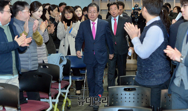 홍준표 자유한국당 대표와 지도부들이 2일 오전 서울 여의도 중앙당사에서 열린 사무처 시무식에 참석하고 있다.