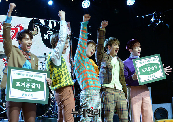 밴드 엔플라잉(N.Flying : 이승협, 권광진, 차훈, 김재현, 유회승)이 2일 오후 서울 마포구 KT&G 상상마당에서 열린 세 번째 미니앨범 '더 핫티스트 : 엔플라잉(THE HOTTEST : N.Flying) 발매 기념 쇼케이스에 참석해 포토타임을 갖고 있다.