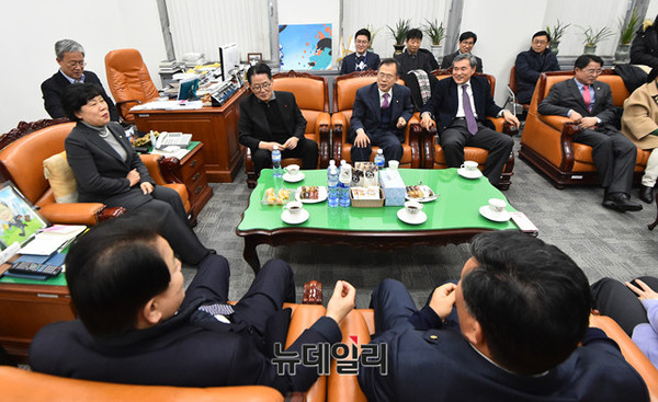 국민의당 통합반대파 의원들이 3일 오후 국회교문위원장실에 모여 바른정당과의 통합에 대한 대책을 논의하고 있다.