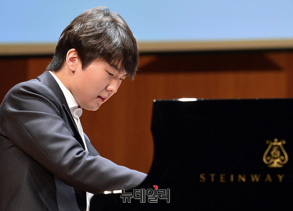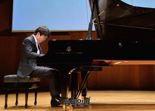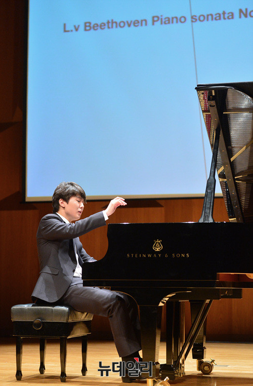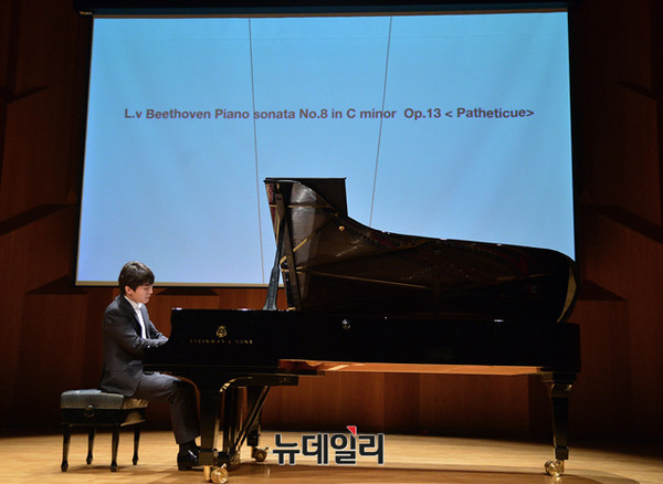 피아니스트 조성진이 4일 오전 예술의전당 IBK챔버홀에서 열린 프레스 컨퍼런스에 참석해 베토밴 피아노 소나타 8번 '비창(Pathetique)'을 연주하고 있다.