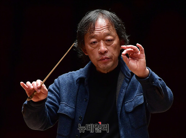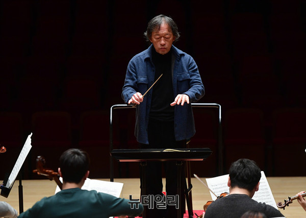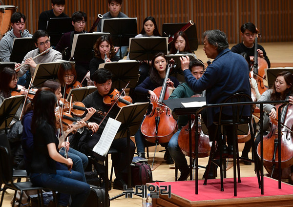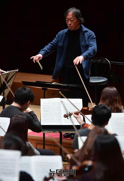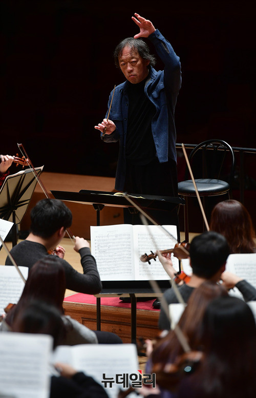 정명훈 음악감독이 5일 오후 서울 송파구 롯데콘서트홀에서 열린 원 코리아 유스 오케스트라 창단 기자간담회에 앞서 열린 리허설에서 지휘를 하고 있다.