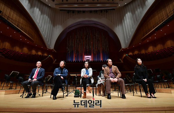 한광규 롯데문화재단 대표, 정명훈 음악감독, 마갈리 모스니에 라디오 프랑스필 플루트 수석, 주세페 에토레 라스칼라 베이스 수석, 김재원 유스 오케스트라 악장(왼쪽부터)이 5일 오후 서울 송파구 롯데콘서트홀에서 열린 원 코리아 유스 오케스트라 창단 기자간담회에서 참석해 자리하고 있다.