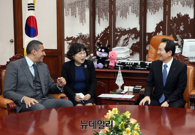 칼둔 칼리파 알 무바락 UAE 아부다비 행정청장이 8일 오후 국회를 찾아 정세균 국회의장을 예방하고 있다. (사진=국회의장실 제공)