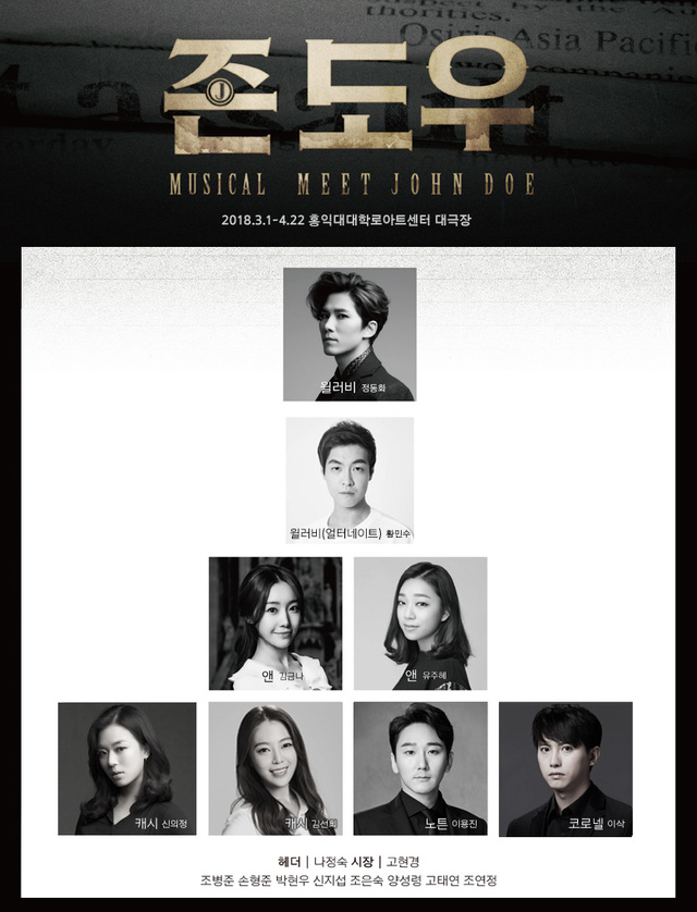 존 도우 사기극의 주인공이 되는 떠돌이 '윌러비' 역에 뮤지컬 정동화와 신예 황민수가 더블 캐스팅됐다. 기자이자 존 도우 사기극을 시작한 장본인 '앤' 역은 김금나·유주혜, 블레틴 신문사의 신인 편집장 '캐시' 역에는 신의정·김선희가 맡는다.