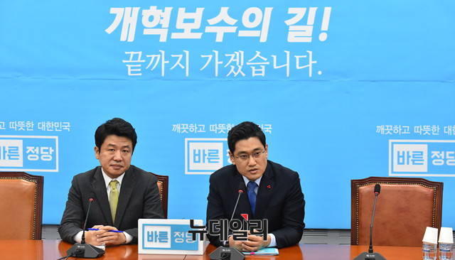 오신환 바른정당 원내대표가 9일 오후 국회에서 의원총회 결과 관련 브리핑을 하고 있다.