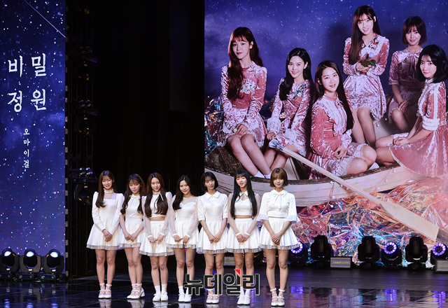 그룹 오마이걸(OH MY GIRL : 효정, 미미, 유아, 승희, 지호, 비니, 아린)이 9일 오후 서울 중구 메사홀에서 열린 다섯 번째 미니앨범 '비밀정원' 발매 기념 쇼케이스에 참석해 포즈를 취하고 있다. 이번 앨범은 멤버 진이의 탈퇴 후 첫 번째 컴백이다.