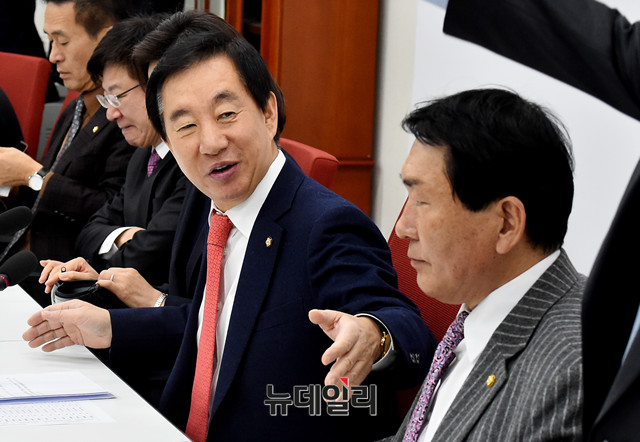 김성태 자유한국당 원내대표가 11일 오전 국회 본청에서 열린 '헌법개정 및 정개특위, 사법개혁특위' 회의에서 의원들과 인사를 나누고 있다.