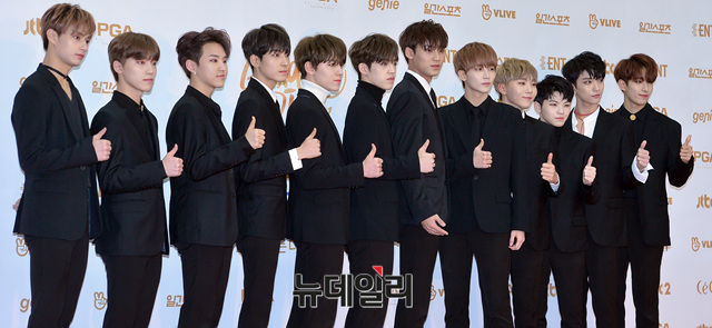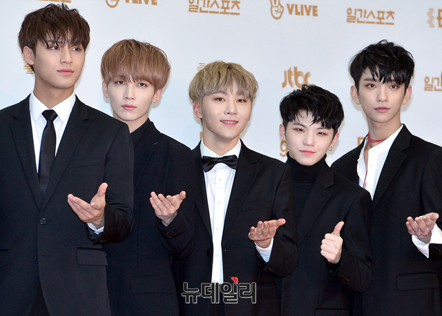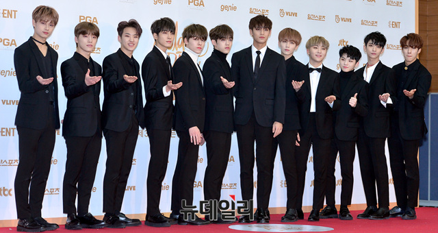 그룹 세븐틴(Seventeen : 에스쿱스, 정한, 조슈아, 준, 호시, 원우, 도겸, 민규, 디에잇, 승관, 버논, 디노, 우지)이 11일 오후 일산 킨텍스에서 열린 '2018 골든디스크 어워즈(GOLDEN DISK AWARDS)'에 참석해 포즈를 취하고 있다.