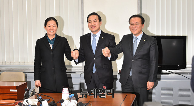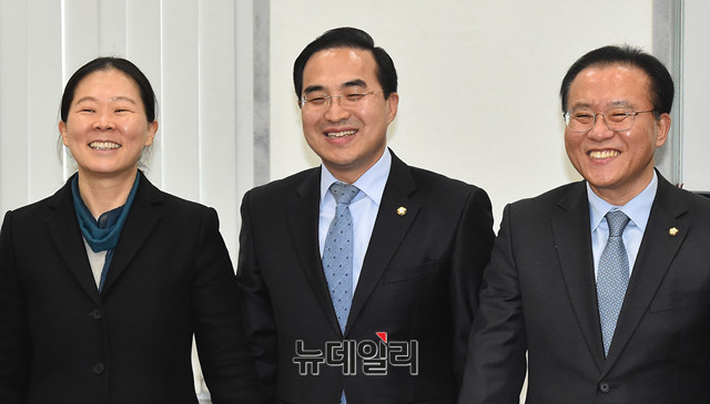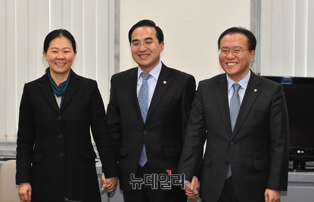 여야 원내수석부대표들(박홍근 더불어민주당, 윤재옥 자유한국당, 권은희 국민의당)이 11일 오후 국회에서 2월 임시국회 일정 논의를 위한 회동에 앞서 기념사진을 촬영하고 있다.
