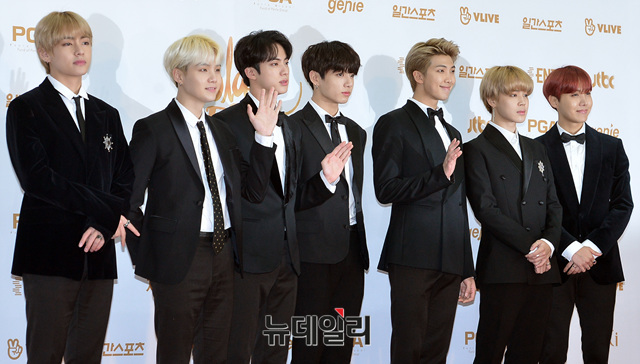 그룹 방탄소년단(RM, 슈가, 진, 제이홉, 지민, 뷔, 정국)이 11일 오후 일산 킨텍스에서 열린 '2018 골든디스크 어워즈(GOLDEN DISK AWARDS)'에 참석해 포즈를 취하고 있다.
