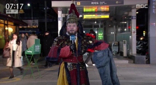 재미있는 건, 7시 16분경 다시 등장한 조세호의 모습. 조세호는 동장군(冬將軍)이 찾아왔다는 걸 표현하려는 듯, 꽁꽁 얼어붙은 갑옷을 입고 재차 카메라에 등장했다. 조세호는 "이렇게 분장을 하고 나와 많이 놀라셨을 것 같다"며 "현재 서울 기온은 영하 15도, 체감 온도는 영하 20도 가까이 내려가고 있다"고 설명했다.
