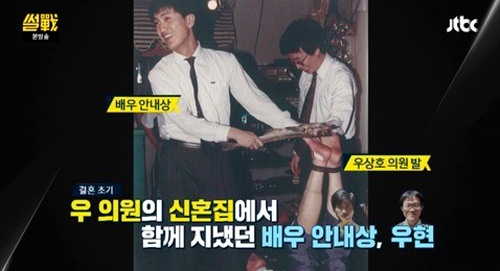 우 의원은 "이 사진을 자세히 보면 우현씨 머리는 삭발한 것"이라고 밝힌 뒤 "우현과 안내상은 제 신혼집에서 함께 지낼 정도로 아주 친했었다"는 에피소드를 전했다.