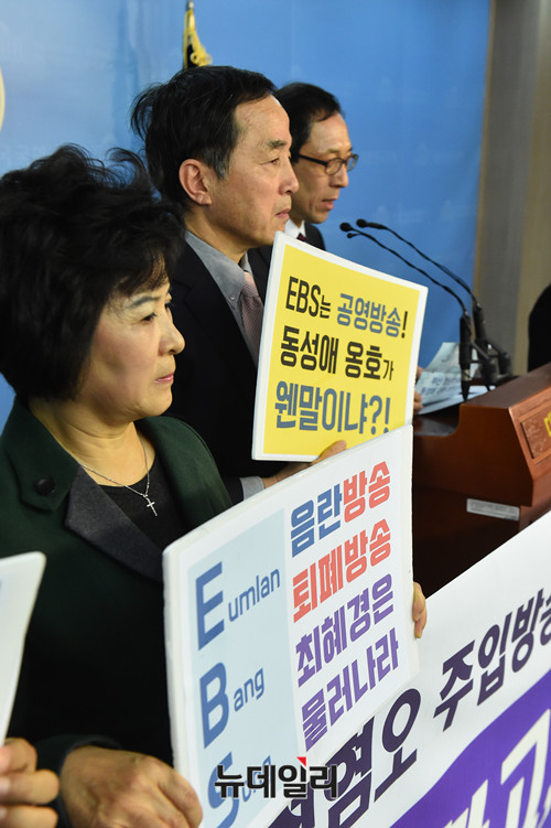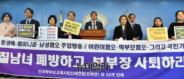 과학기술정보방송통신위원회 박대출 자유한국당 간사와 전국학부모교육시민단체연합 외 22개 단체 관계자들이 15일 오전 국회 정론관에서 'EBS 까칠남녀' 프로그램이 동성애를 미화하고 성행위를 묘사했다며 폐지촉구 공동 기자회견을 하고 있다.