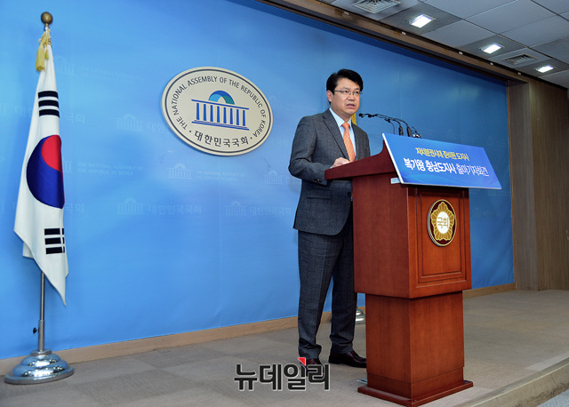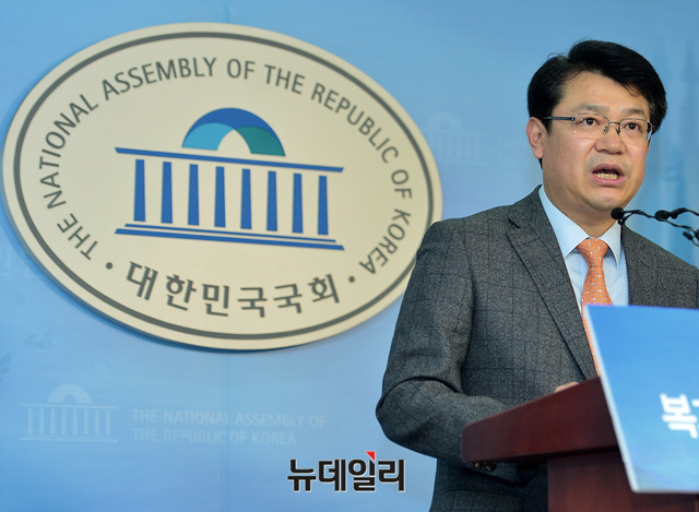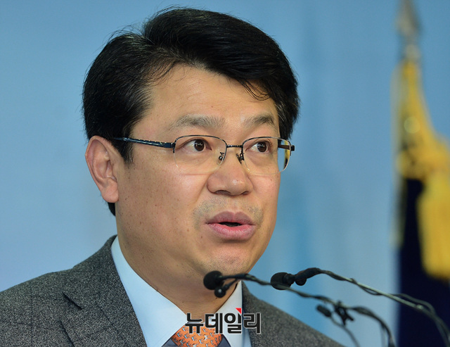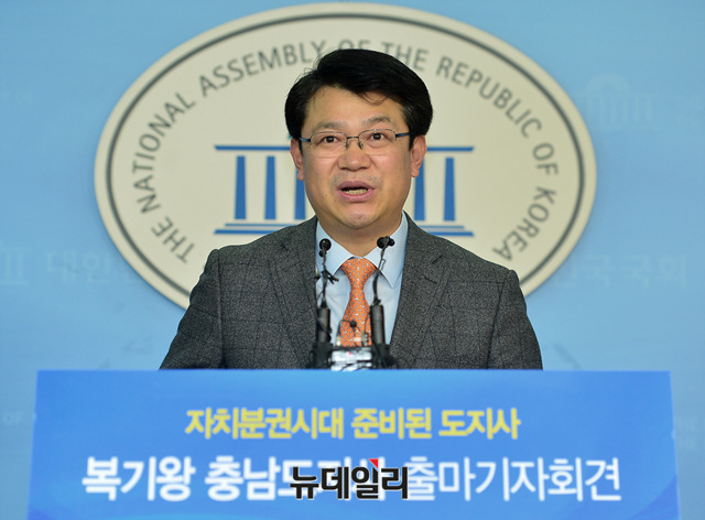 더불어민주당 소속 복기왕 충남 아산시장이 16일 오후 국회 정론관에서 6·13 지방선거 충남도지사 출마를 선언하고 있다.