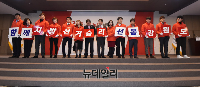 홍준표 자유한국당 대표가 16일 오후 강원 춘천시에서 열린 자유한국당 강원도당 신년인사회에서 당원들과 "함께 지방선거 승리 선봉 강원도"라고 적힌 플래카드를 들고 있다. (강원 춘천=뉴데일리 이종현 기자)