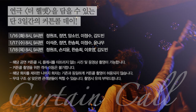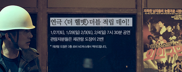 연극 'The Helmet(더 헬멧)-Room’s Vol.1'이 관객들을 위한 다양한 이벤트를 마련했다.16일부터 오는 18일까지 오후 8시, 9시 30분 공연 총 6회차 동안 '커튼콜 데이'가 진행된다. '커튼콜 데이'는 관객들에게 공연의 추억을 남길 수 있는 특별한 이벤트다.이어 27일, 28일, 2월 3~4일 총 4일동안 오후 7시 30분 공연은 재관람 카드에 도장을 2번 날인 받을 수 있는 '더블 적립 데이'를 실시한다.