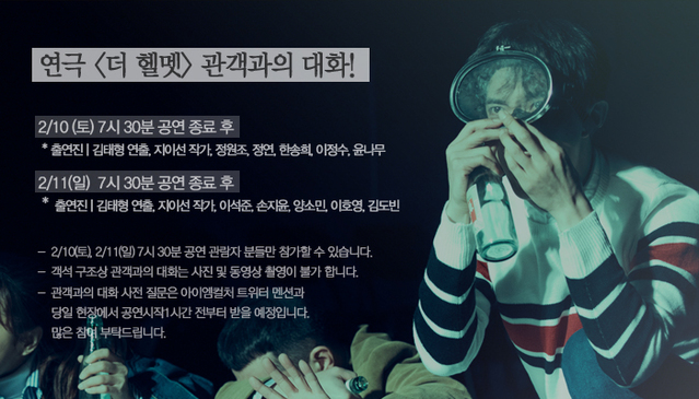 마지막으로 2월 10~11일 오후 7시 30분 공연 종료 후 무대에서 연극 '더 헬멧'의 배우들, 연출, 작가와 함께 하는 '관객과의 대화' 시간을 준비했다. 관객이 공연에 대해 궁금했던 모든 것을 배우와 창작진에게 직접 물어볼 수 있는 유일한 시간이 될 것으로 보인다.10일는 정원조, 정연, 한송희, 이정수, 윤나무, 11일은 이석준, 손지윤, 양소민, 이호영, 김도빈이 참여하며, 김태형 연출과 지이선 작가는 이틀 모두 참석한다.연극 '더 헬멧'은 '하얀 헬멧'을 키워드로 대한민국 서울, 시리아 알레포 2개의 시공간으로 나눠진다. 객석은 같은 공간 안에 있지만 벽을 사이에 두고 분리된 공간에서 서로 다른 극을 보게 된다.3월 4일까지 대학로 아트원씨어터 3관에서 공연된다. 전석 3만원. 문의 02-541-2929.