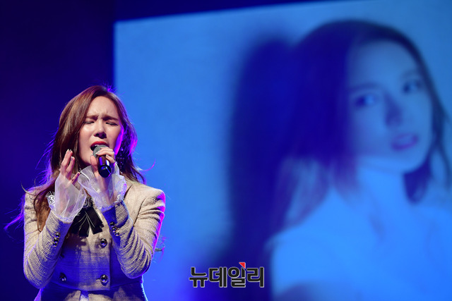 가수 미교가 18일 오전 서울 강남구 일지아트홀에서 데뷔 싱글앨범 'YOU&I' 쇼케이스에서 수록곡을 선보이고 있다.