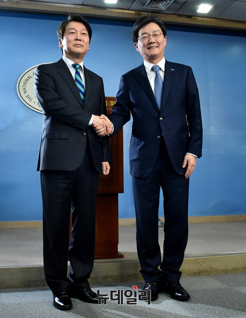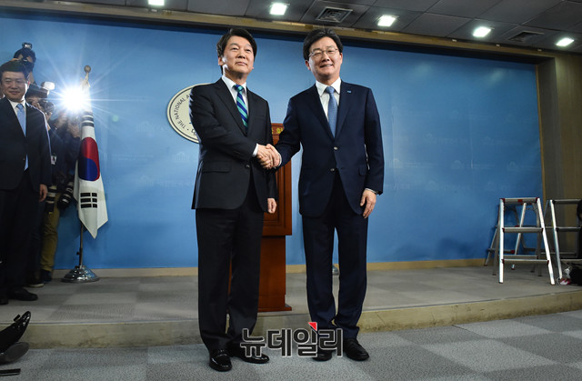 국민의당 안철수 대표와 바른정당 유승민 대표가 18일 오전 국회 정론관에서 통합 공동선언문 발표 후 악수를 나누고 있다.