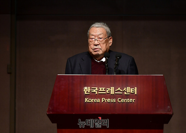 최서면 방촌독도연구회 명예이사장이 18일 오전 서울 중구 한국프레스센터에서 진행된 '독도연구 70년의 총괄과 향후 연구 방향의 모색' 국제학술회의에서 축사를 하고 있다.