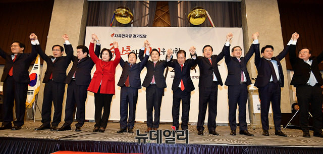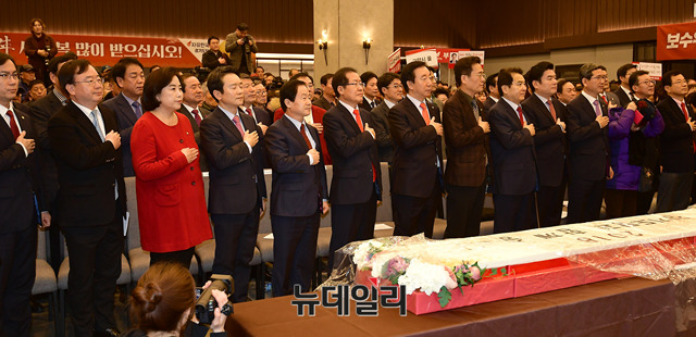 남경필 경기지사, 주광덕 경기도당위원장 직무대행, 홍준표 자유한국당 대표, 김성태 원내대표, 함진규 정책위의장(왼쪽부터)을 비롯한 당원들이 18일 오후 경기 수원시 WI컨벤션에서 열린 경기도당 신년인사회에서 국민의례를 하고 있다.(경기 수원=뉴데일리 정상윤 기자)