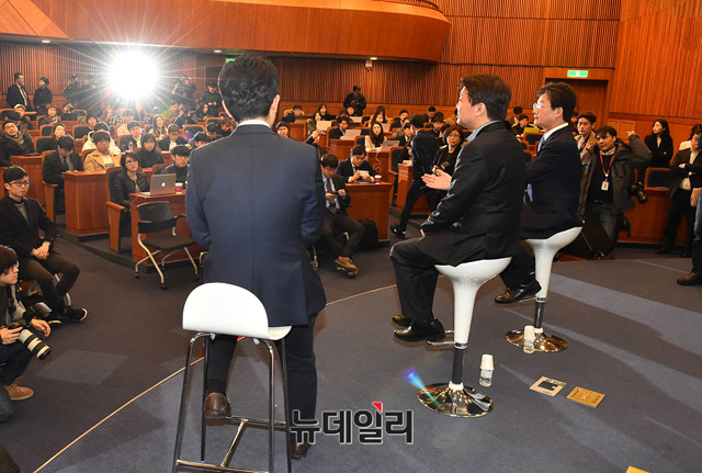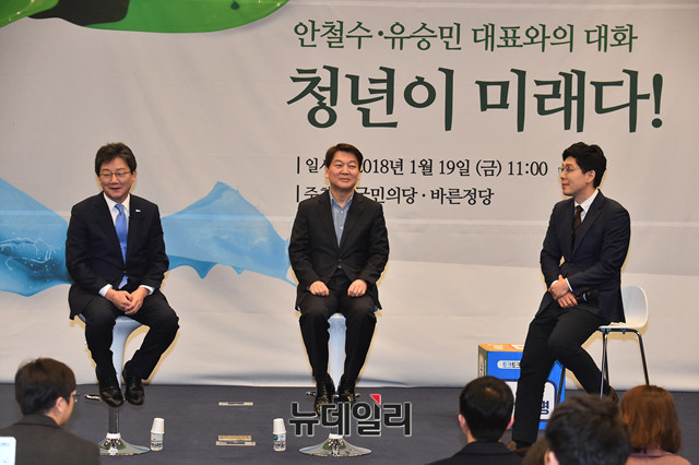 국민의당 안철수, 바른정당 유승민 대표가 19일 오전 국회 헌정기념관에서 열린 안철수-유승민 토크콘서트 '청년이 미래다'에 참석해 대화를 이어가고 있다.