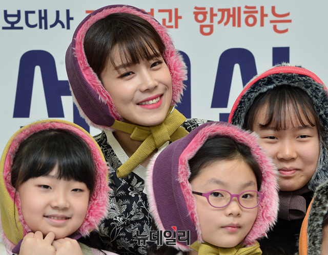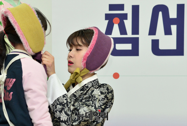 한복 홍대보사를 맡은 개그맨 장도연과 초등학생들이 19일 오후 서울 중구 문화역서울284에서 열린 '장도연과 함께하는 침선교실'에 참석해 전통방한용품 볼끼를 착용하고 있다.