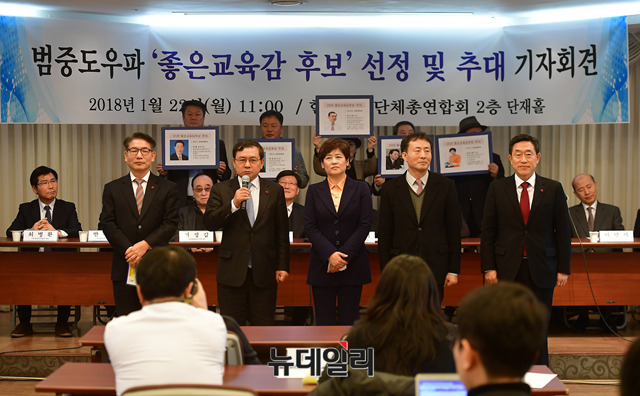 최태호 중부대 교수, 김선유 전 진주교대 총장, 강은희 전 여성가족부 장관, 임해규 전 경기연구원장, 박흥수 전 울산교육국장(왼쪽부터)이 22일 오전 서울 서초구 한국교총 단재홀에서 열린 범중도우파 '좋은교육감 후보' 선정 및 추대 기자회견에서 좋은교육감 후보 선정 소감을 발표하고 있다.