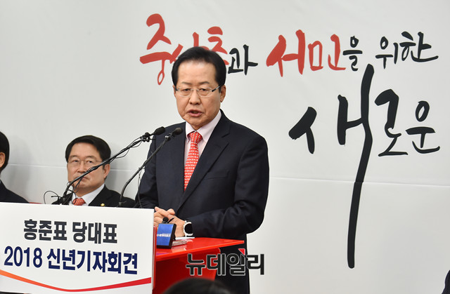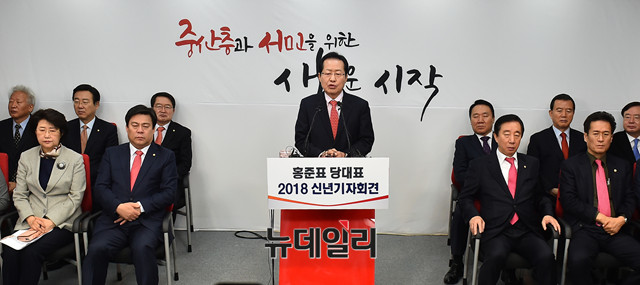 홍준표 자유한국당 대표가 22일 오전 서울 여의도 중앙당사에서 열린 신년기자회견에서 기자들과 질의응답 시간을 갖고 있다.