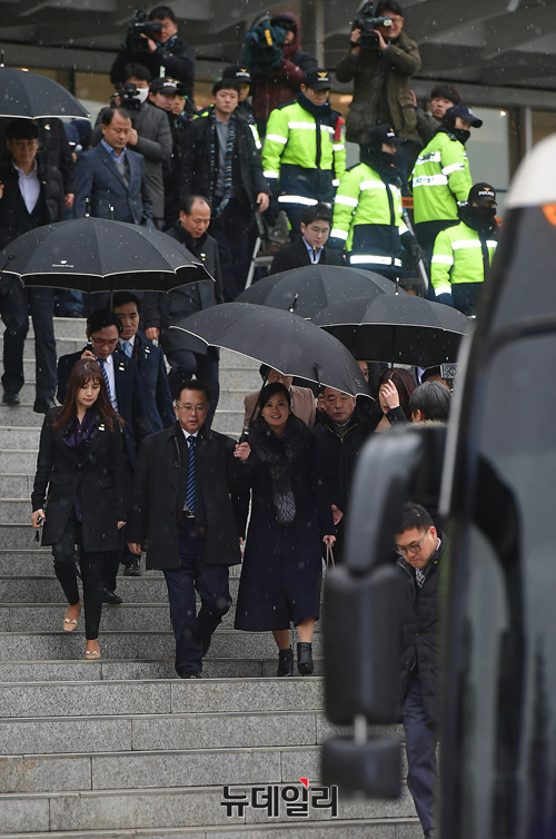 현송월 북한 삼지연관현악단장과 사전점검단 일행이 22일 오후 서울 중구 국립극장 해오름관을 방문해 시설을 둘러본 직후 이동하고 있다.