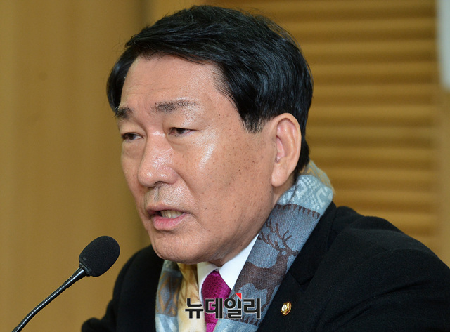안상수 자유한국당 의원이 24일 오전 국회 의원회관에서 열린 '문재인정부의 기업정책, 일자리 창출 가능한가?' 토론회에 참석해 축사를 하고 있다.