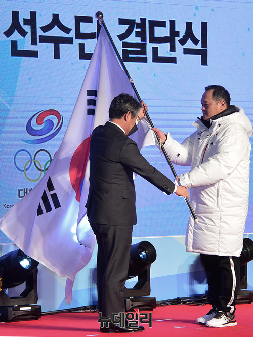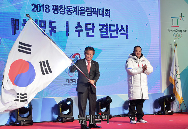 김지용 평창동계올림픽 선수단장이 24일 오후 서울 송파구 올림픽파크텔에서 열린 '2018 평창동계올림픽 대한민국 선수단 결단식'에서 이기흥 대한체육회장에게 단기를 전달받고 있다.