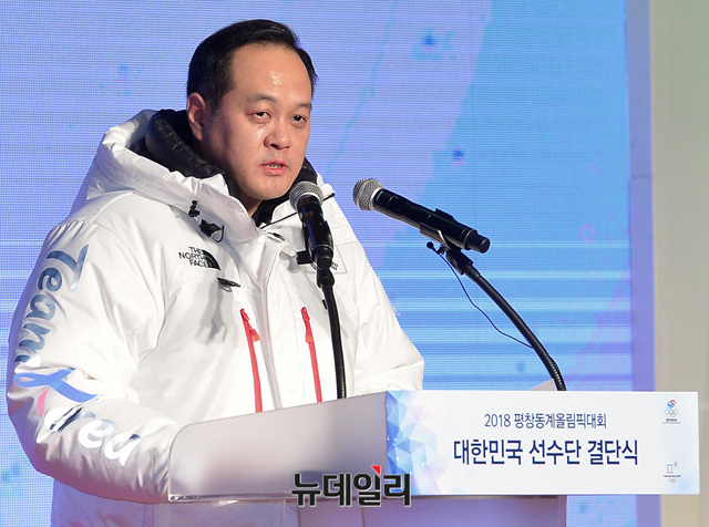 김지용 평창동계올림픽 선수단장이 24일 오후 서울 송파구 올림픽파크텔에서 열린 '2018 평창동계올림픽 대한민국 선수단 결단식'에서 이낙연 국무총리의 격려사 후 답사를 하고 있다.