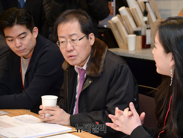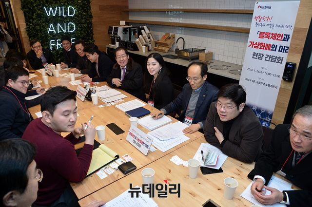 홍준표 자유한국당 대표가 24일 오후 서울 강남구 브이플렉스 창업기업 소통라운지에서 열린 '블록체인과 가상화폐의 미래' 간담회에 참석해 블록체인 업계 관계자 발언을 경청하고 있다.