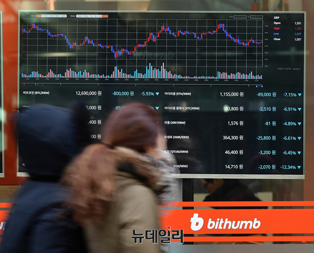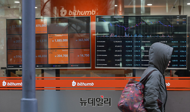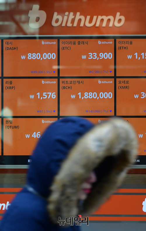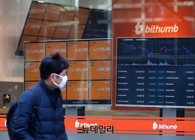 암호화폐 거래실명제를 앞둔 30일 오후 서울 중구에 위치한 암호화폐 거래소에 설치된 전광판을 보며 시민들이 지나가고 있다.