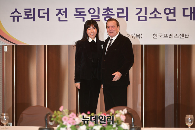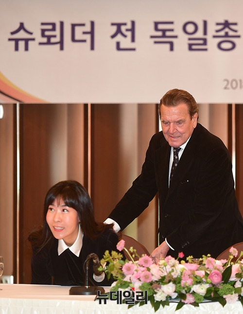 슈뢰더 전 독일총리와 김소연 씨가 25일 서울 중구 한국프레스센터에서 기자회견에 참석해 자리하고 있다.
