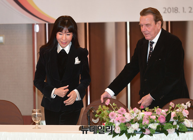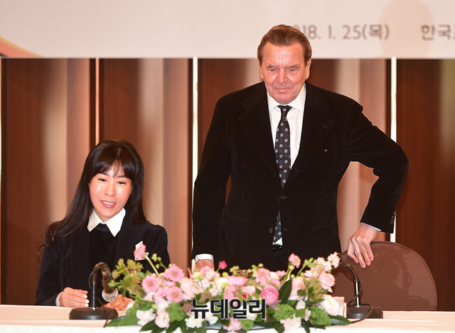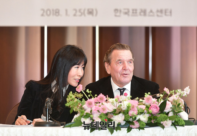 슈뢰더 전 독일총리와 김소연 씨가 25일 서울 중구 한국프레스센터에서 기자회견에 참석해 자리하고 있다.