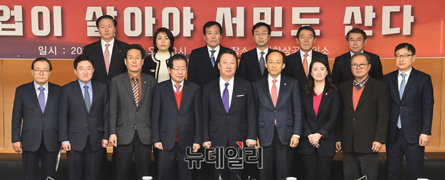 홍준표 자유한국당 대표와 박용만 대한상공회의소 회장 등 참석자들이 25일 오후 서울 중구 대한상공회의소에서 열린 '자유한국당-대한상공회의소 정책간담회'에서 기념사진을 촬영하고 있다.