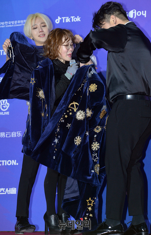 그룹 슈퍼주니어(희철, 신동, 동해, 예성, 은혁, 이특)가 25일 오후 서울 구로구 고척스카이돔에서 열린 '하이원 서울가요대상'에 참석해 사회를 맡은 박슬기에게 외투를 벗어주고 있다.