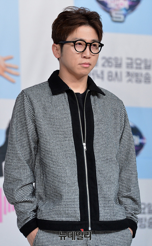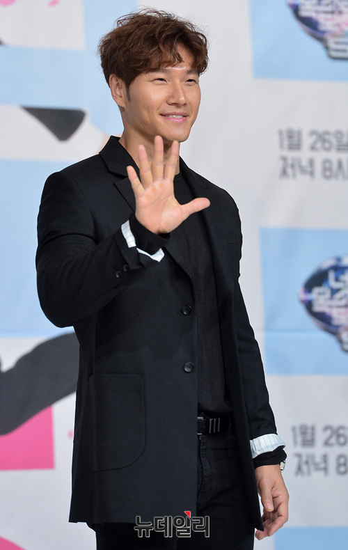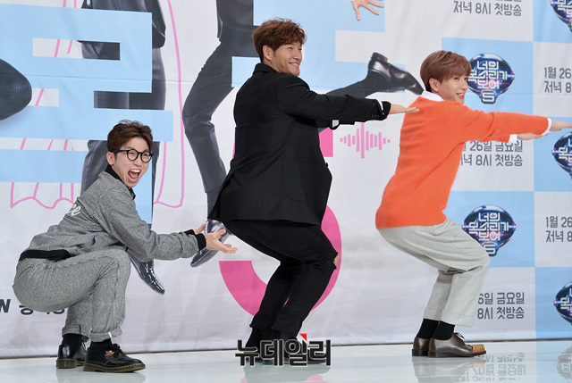 예능프로그램 '너의목소리가보여5' 출연자(김종국, 이특, 유세윤)들이 26일 오전 서울 영등포 타임스퀘어에서 열린 제작발표회에 참석해 포즈를 취하고 있다.