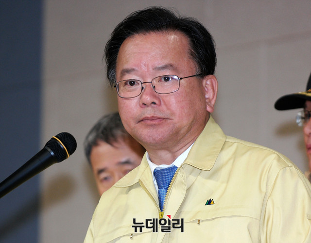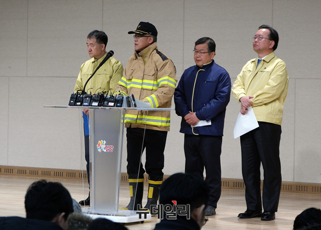 김부겸 행정안전부 장관이 26일 오후 경남 밀양시청 대강당에서 밀양세종병원 사고 대책과 관련해 합동 브리핑을 열고, 발언을 하고 있다. 이날 브리핑에는 박능후 보건복지부 장관, 최만우 밀양소방서장, 박일호 밀양시장, 김부겸 행정안전부 장관이 참석했다.