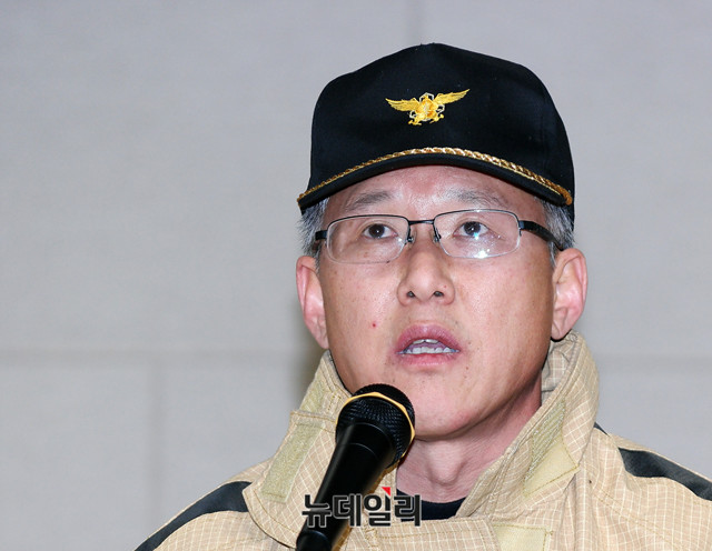 최만우 밀양소방서장이 26일 오후 경남 밀양시청 대강당에서 밀양세종병원 사고 대책과 관련해 합동 브리핑을 열고, 발언을 하고 있다. 이날 브리핑에는 박능후 보건복지부 장관, 최만우 밀양소방서장, 박일호 밀양시장, 김부겸 행정안전부 장관이 참석했다.