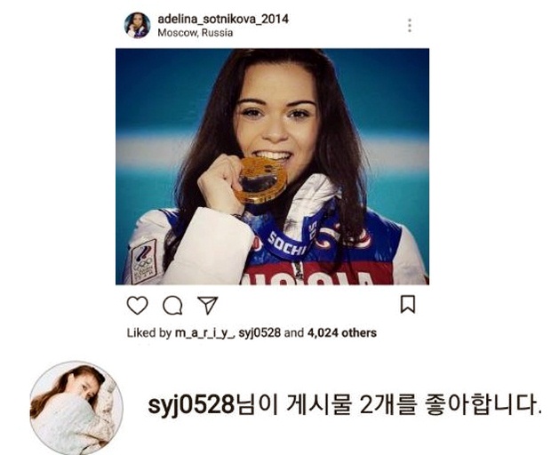 단순한 실수였을까? 전 체조선수 손연재가 2014년 소치 동계올림픽 피겨스케이팅 여자 싱글 부문에서 김연아를 제치고 금메달을 획득한 소트니코바의 SNS 사진에 '좋아요'를 누른 사실이 알려져 네티즌의 관심을 모으고 있다.